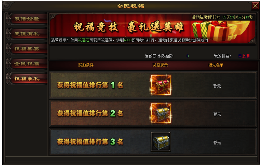 活动内容:活动期间,获得祝福值达到4000以上即可参与排名,排名前三可以获得排名奖励
