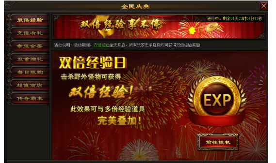 活动内容:活动期间,双倍经验全天开启,急速升级爽歪歪!