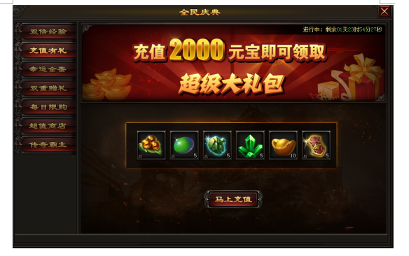 活动内容:活动期间,充值2000元宝即可领取超值奖励回馈。