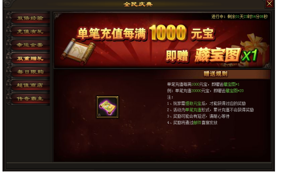 活动内容:活动期间,单笔充值每满1000元宝,即赠藏宝图*1,多充多送哦!