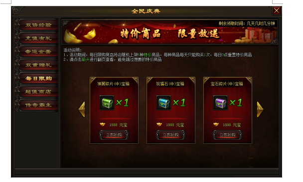 活动内容:活动期间,每天都可以购买到超值折扣道具,机不可失!