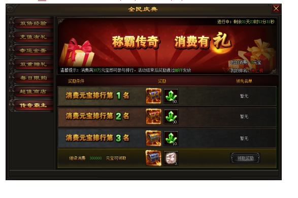 活动内容:活动期间,消费满30万元宝即可参与排行,活动结束后,奖励通过邮件发放。