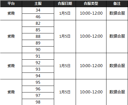 紫霞《烈火封神》定于2018年1月5日10:00-12:00对部分区服进行合服,多个区服同时进入维护。合服期间将无法登录游戏,请各位玩家提前做好下线准备,避免不必要的损失。具体区服如下: