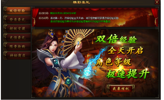 活动内容:活动第一天,双倍经验全天开启,消灭怪物都可获得双倍经验奖励,活动双倍经验效果可与多倍经验卷轴和VIP经验BUFF等叠加