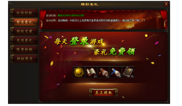 活动内容:活动期间,80级及以上玩家每天登录游戏即可领取超值豪礼,错过就没有了哦!