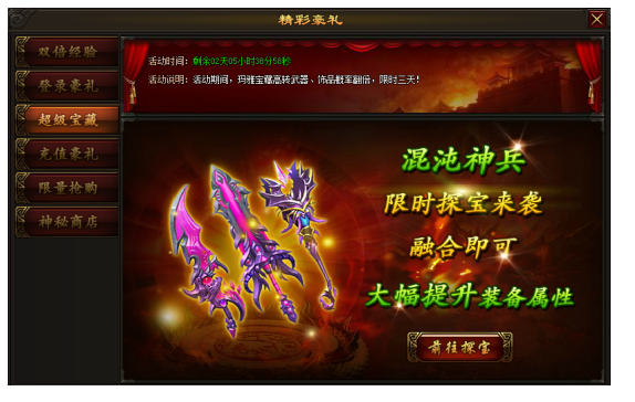 活动内容:活动期间,玛雅宝藏混沌神兵限时产出,限时三天!!!