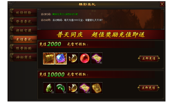 活动内容:活动期间,每天充值2000元宝,海量豪礼天天领!