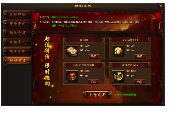 活动内容:活动期间,神秘商店稀有道具特价甩卖,每2小时(或商品全部购买后)自动刷新商品!消耗199元宝可立即刷新