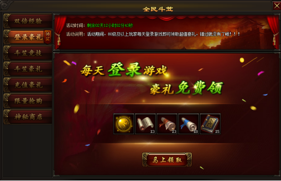 活动期间,80级及以上的玩家每天登录游戏即可领取超值豪礼,错过就没有了哦!