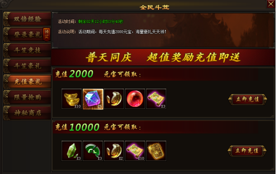 活动期间,充值2000元宝、10000元宝将会获得奖励。
