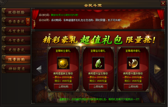 活动期间,内功、魂珠、成就、BOSS积分和转生等材料礼包限时折扣,超低价格,不容错过!