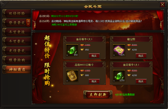 活动期间,每两小时神秘商店会自动刷新一批道具,也可花费元宝立即刷新,大量道具限时等你抢购,更有机会刷出珍稀时装,机会不容错过。