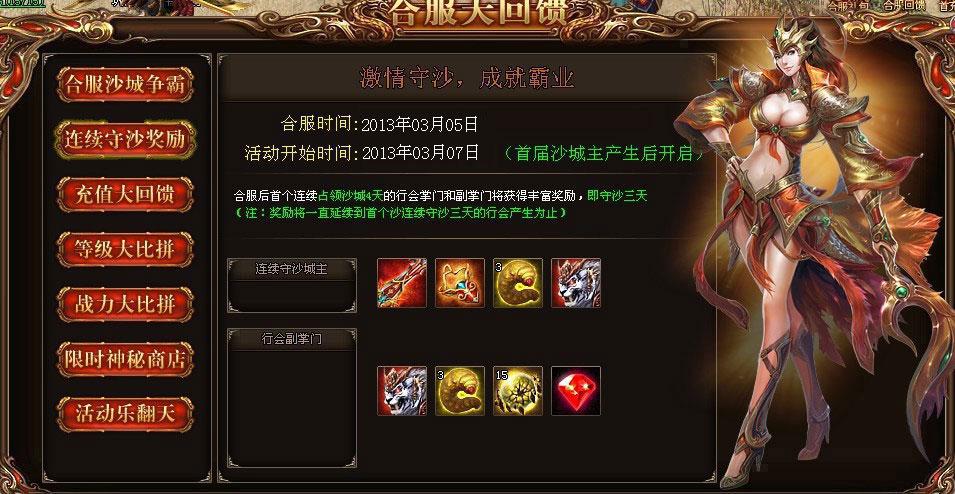 活动规则:合服后首个连续占领沙城4天的行会掌门和副掌门将获得丰富奖励,即守沙三天(注:奖励将一直延续到首个沙连续守沙三天的行会产生为止)