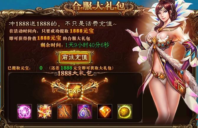 活动规则:在活动时间内,只要成功提取1888元宝,即可获得价值1888元宝的合服大礼包。