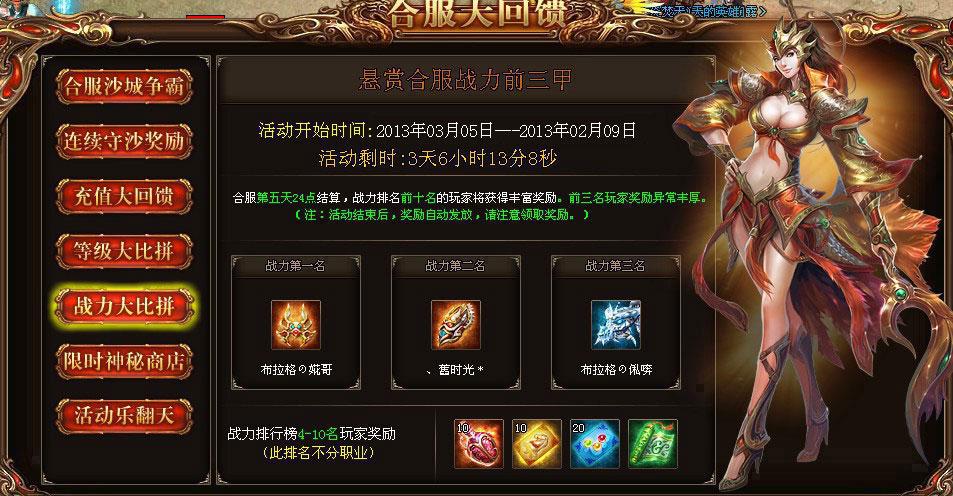 活动奖励:第一名:战神宝甲*1;第二名:战神腰带*1;第三名:战神靴子*1