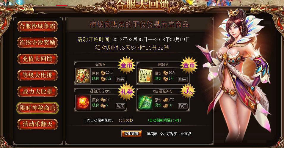 活动内容:合服活动不仅仅只是游戏中的游戏内容,还有商城道具呢,神秘商店卖的不仅仅是元宝商品。