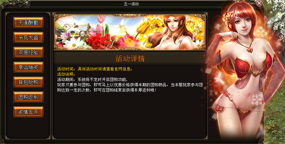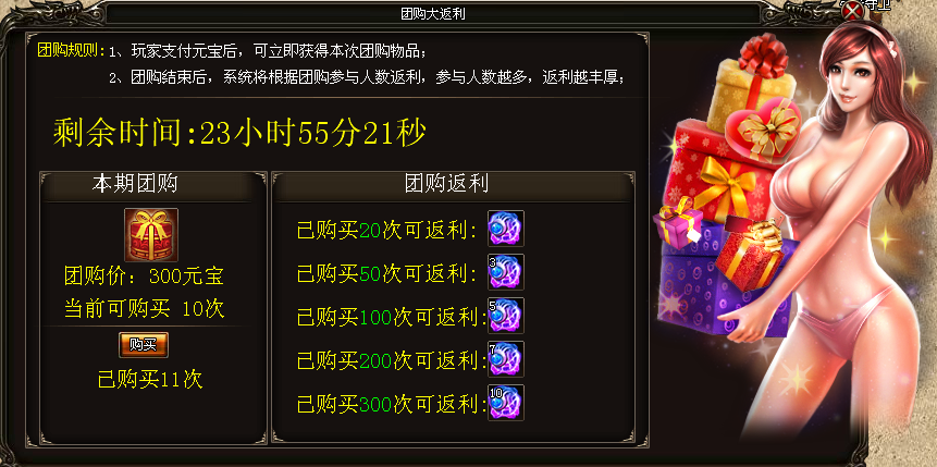 活动内容:玩家只要参与团购,即可马上以优惠的价格获得本期团购的物品,当本服玩家与团购达到一定的次数,即可以团购结束后获得丰厚返利。
