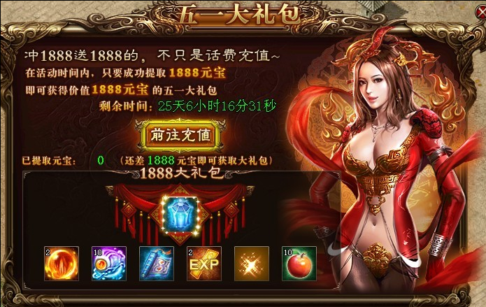 活动内容:活动期间内,只要累计提取1888元宝,即可获得丰厚奖励。奖励只可以领取一次;