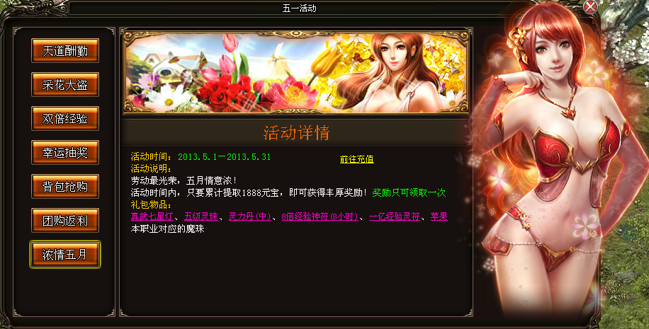 活动奖励:五.1特惠包(三级灵珠*2、快马鞭*15)、五.一惊喜包(开天之翼1楼、5级魔防魂石*1、荣誉徽印*1)、五.一狂欢包(5级生命魂石*1、5级攻击魂石*1[按职业]、灵魂水晶*10、超级英雄经验丹*1、10倍经验神符*1)