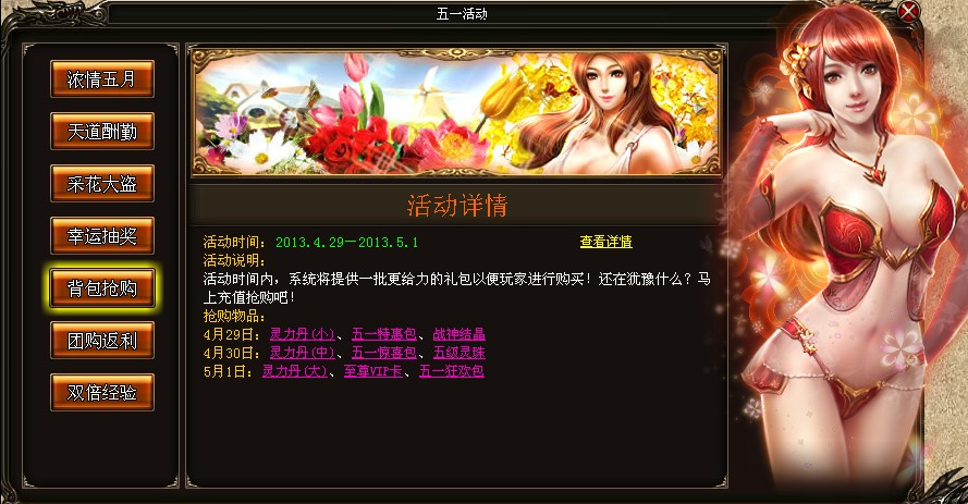 活动内容:在活动时间内,系统将提供一批更给力的礼包供玩家抢购,还在犹豫什么?马上抢购吧!