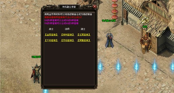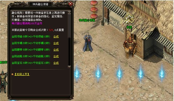 功能指引:装备熔合,可以在土城NPC“神兵熔合使者”处进行装备合成,可以将低级的装备合成为高级品质的装备。真正实现低级装备循环利用。