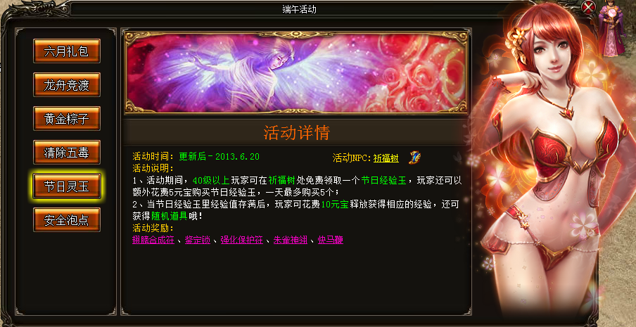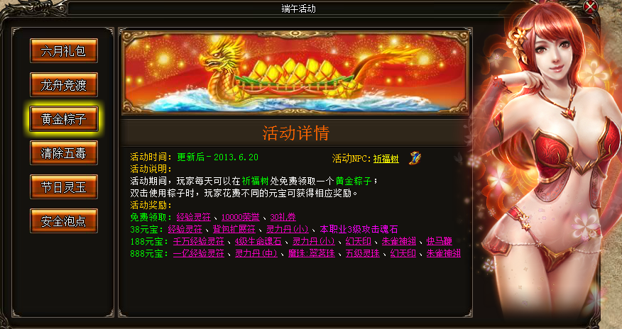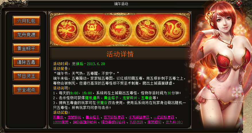 活动奖励:五毒蛊、龙舟碎片、黄金碎片、百万经验灵符、千万经验灵符、一亿经验灵符、10000荣誉、超级英雄经验丹、强效英雄经验丹、五级灵珠、荣誉徽印、灵力丹(中);