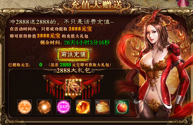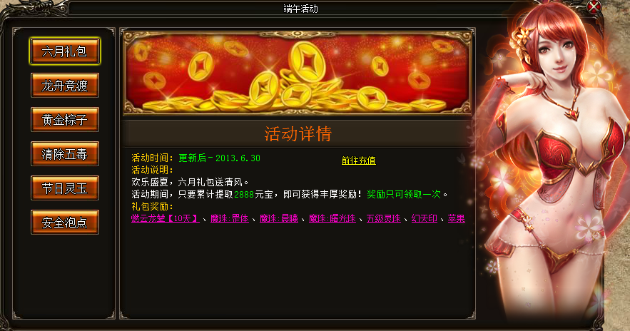 活动内容:欢乐盛夏,六月礼包送清风,活动期间,只要累计提取2888元宝,即可获得丰厚的奖励!奖励只可领取一次。