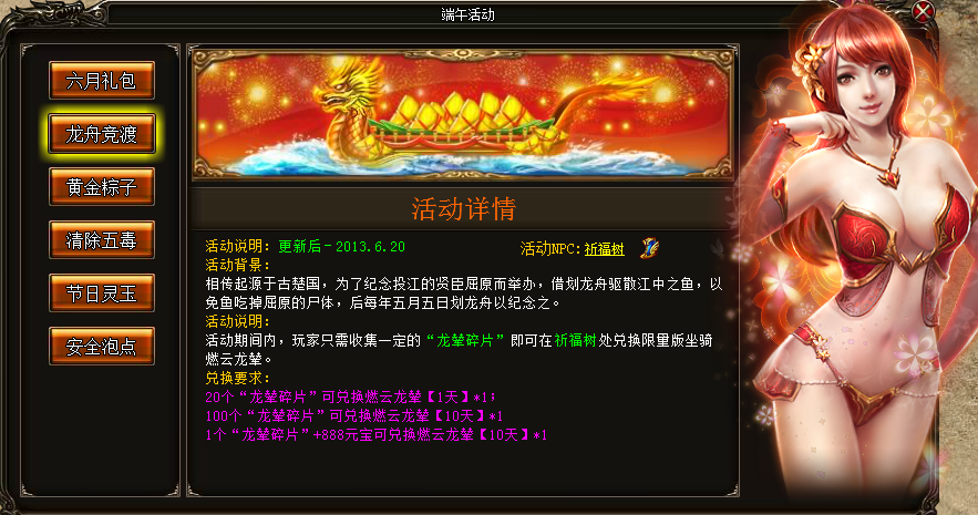 活动期间内,玩家只需收集一定的“龙辇碎片”即可在祝福树处兑换限量版坐骑端午龙舟。