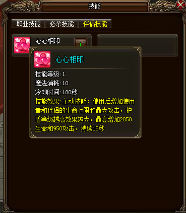 佩戴2级护盾可激活新增的夫妻技能:心心相印,该技能使用后可增加自身和伴侣的生命值上限和最大攻击,护盾等级越高,该效果越大。夫妻技能书可在道具商城购买获得。