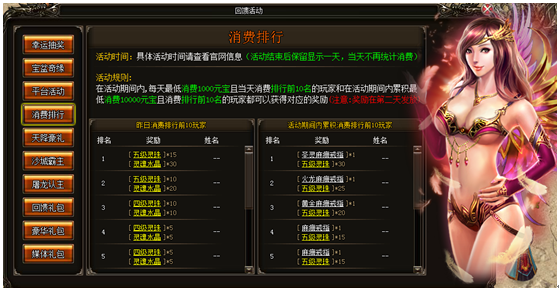 1. 在活动期间内,当天消费元宝排行前10的玩家且最低消费1000元宝都可以获得对应的奖励,奖励会在第二天发放,玩家上线就会在任务栏的右侧收到奖励提示。请给予背包足够的空间