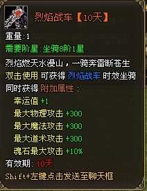 活动期间每位玩家当日消费满10000元宝,即送烈火战车【10天】*1