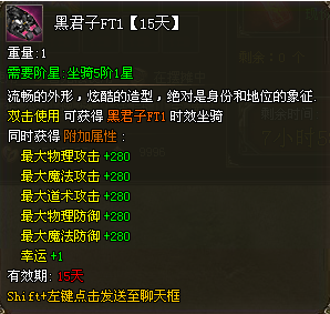 活动期间每位玩家当日消费满8000元宝,即送黑君子FT1【15天】*1