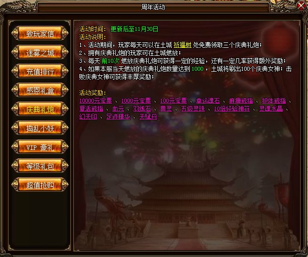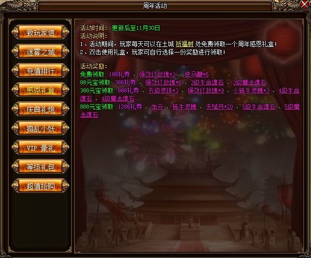 活动玩法:活动期间,玩家每天可以在祈福树处免费领取3个庆典礼炮,礼炮可以在土城燃放。每天前10次燃放庆典礼炮可获得大量经验,如果本服当天燃放礼炮数量达到1000后,土城将出现一批庆典女神,击败她们就能获得丰厚奖励。