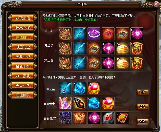 活动玩法:活动期间,提取元宝达10万且本服排行前3的玩家,可获得排名奖励。所有在活动期间提取达一定数量元宝的玩家都可获得特别奖励礼包。