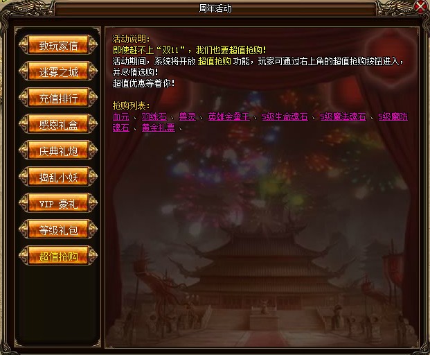 活动玩法:活动期间,系统将开放超值抢购功能,玩家可尽情选购。
