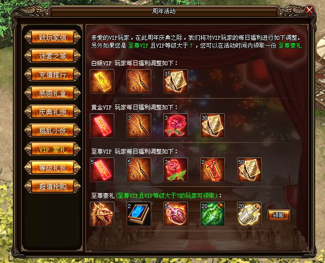 活动玩法:活动期间,我们将对VIP玩家的每日福利进行调整,另外,至尊VIP且VIP等级大于7的玩家还能攘外领取一份至尊豪礼。