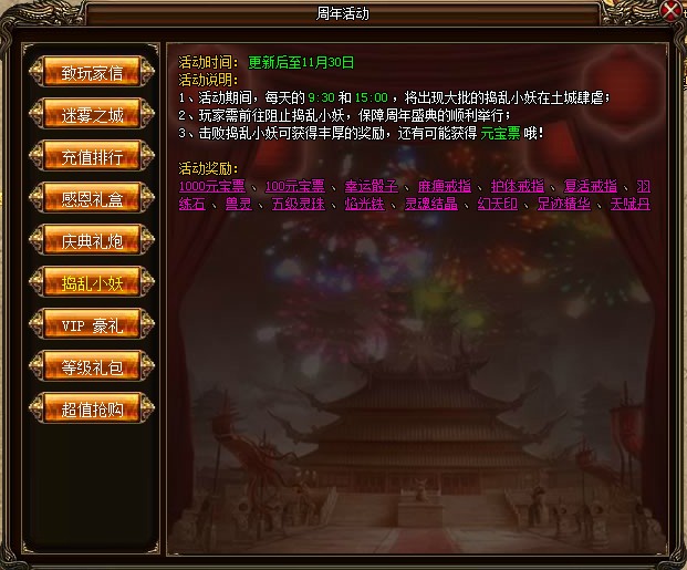 活动奖励:1000元宝票、100元宝票、幸运骰子、麻痹戒指、护体戒指、复活戒指、羽练石、兽灵、五级灵珠、焰光铁、灵魂结晶、幻天印、足迹精华、天赋丹。