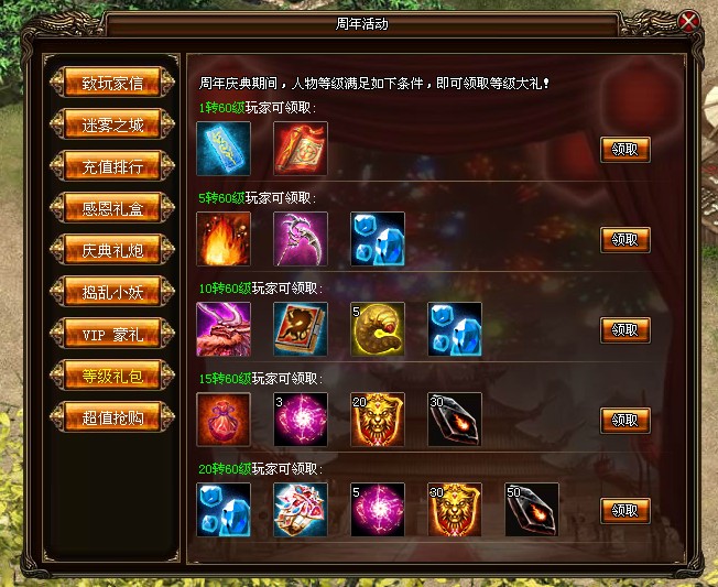 上天总是眷顾勤奋的人们,周年庆活动期间,只要人物达到一定等级,即可领取等级大礼。