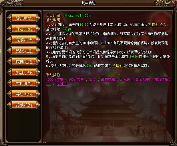 活动玩法:通过祈福树进入迷雾之城消灭BUG和漏洞,获得修复的代码换取积分。或者击杀严重BUG并在1分钟内押送到程序大神处获得积分,当天积分前50的玩家可以领取排名奖励。在迷雾之城中玩家视野将受到限制,玩家可以在程序大神处购买道具消除视野迷雾。