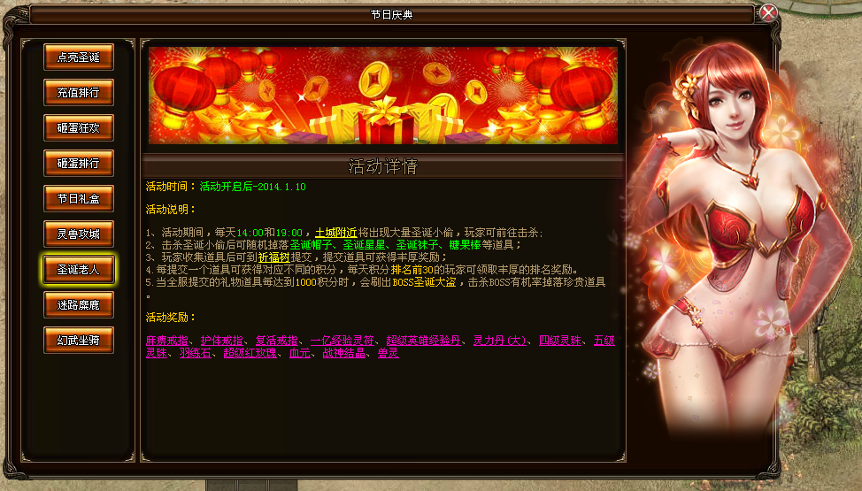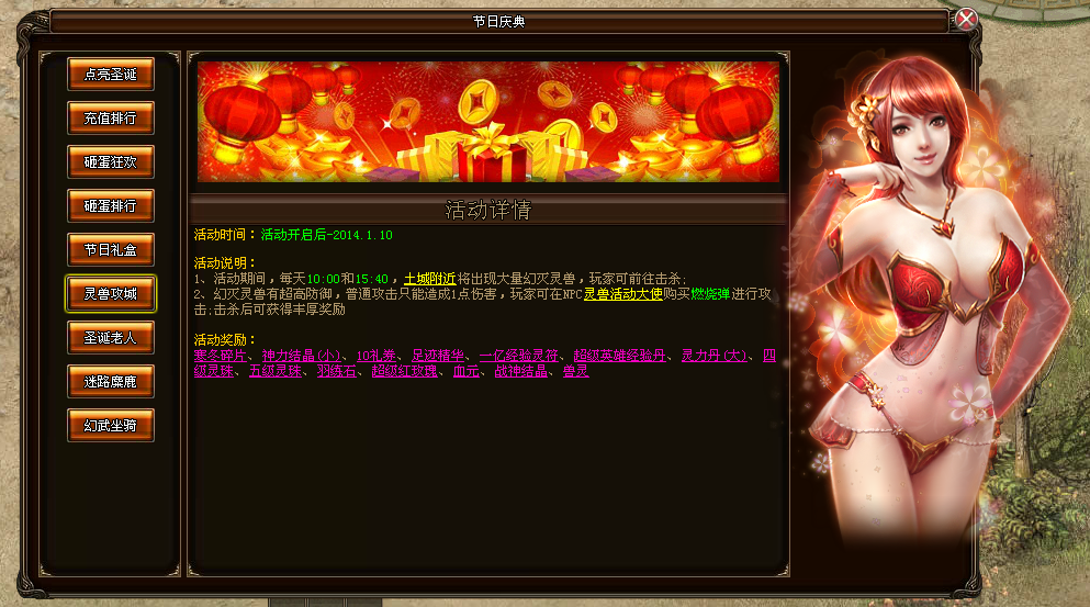 谁说圣诞节一定要甜蜜浪漫?《烈火战神》为你带来动感十足,热闹非凡的万人狂欢圣诞之夜!九大节庆活动,砸蛋狂欢,灵兽攻城,营救麋鹿,万人点亮圣诞树!圣诞节绝版特色幻武、坐骑等超级大礼等着你哦!