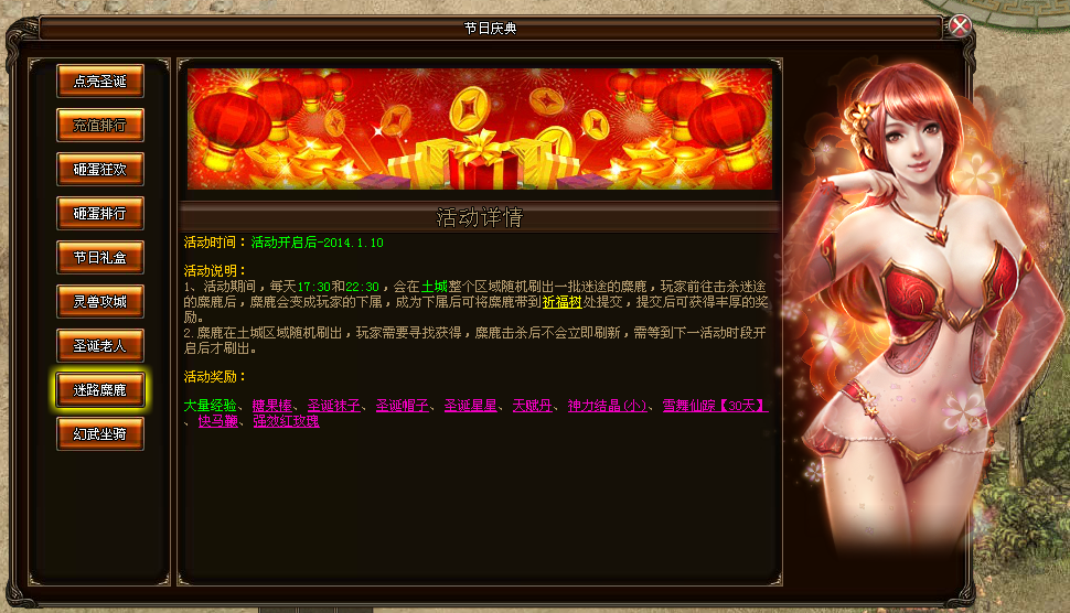 大量经验、糖果棒、圣诞袜子、圣诞帽子、圣诞星星、天赋丹、神力结晶(小)、雪舞仙踪【30天】、快马鞭、强效红玫瑰