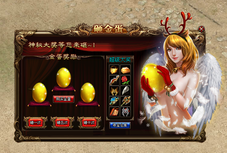 参与方式:活动期间,玩家可到商城购买金蛋,双击金蛋砸开后可以获得许多丰厚奖励,有机会获得70级武器和黄金屠龙装备,以及各种稀有极品道具。