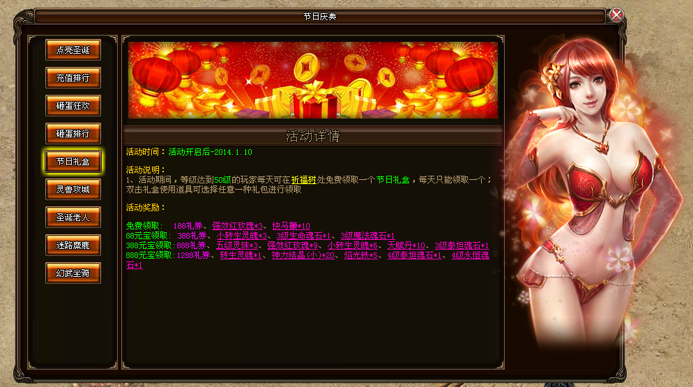 参与方式:活动期间,等级达到50级的玩家每天可在祈福树处免费领取一个节日礼盒,每天只能领取一个;双击礼盒使用道具可选择任意一种礼包进行领取。