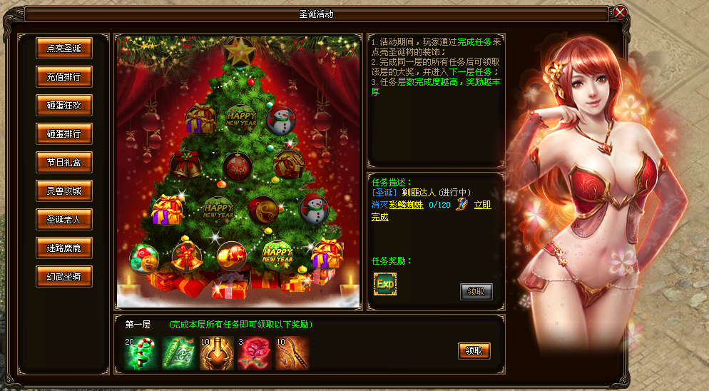 参与方式:活动期间,玩家通过完成任务来点亮圣诞树的装饰,完成同一层的所有任务后可领取该层的大奖,并进入下一层任务,任务层数完成度越高,奖励越丰厚。任务每天重置,第二天可重新完成任务领取奖励。