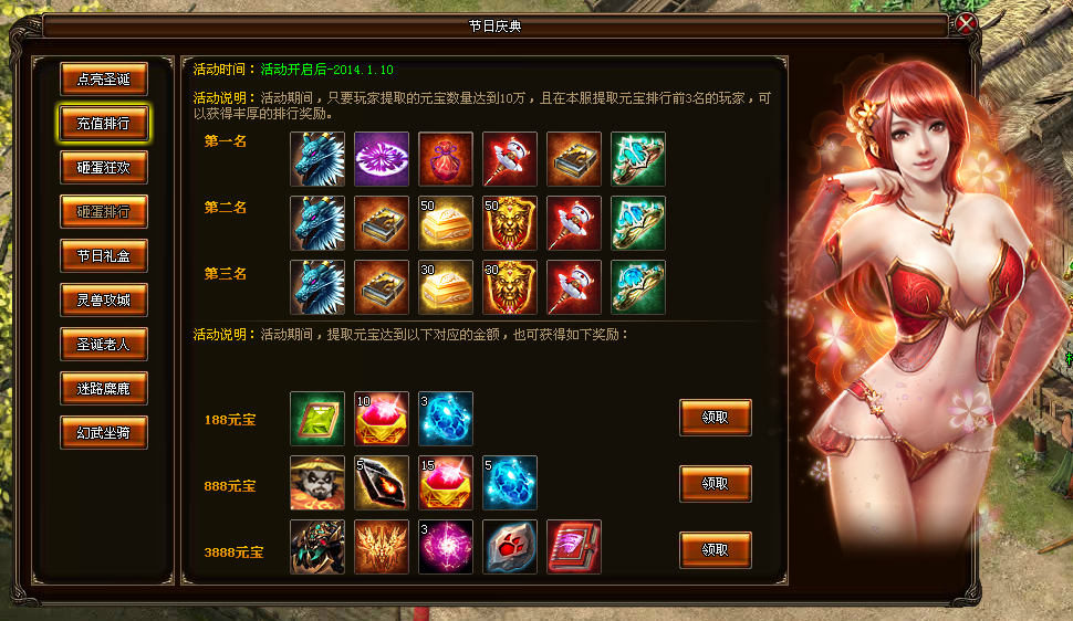 参与方式:活动期间,只要玩家提取的元宝数量达到10万,且在本服提取元宝排行前3名的玩家,可以获得丰厚的排行奖励。同时在活动期间累计提取元宝达一定金额也可获得对应奖励。