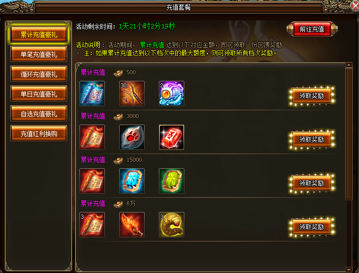 需要后台开启各种方案,开启活动后,角色充值达到套餐要求可获得对应奖励