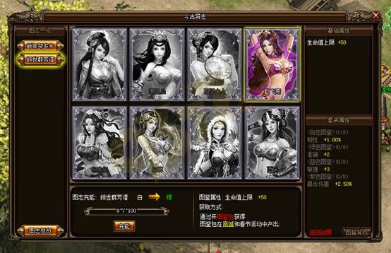 系统4转50级开放,你可以通过开启图鉴包获得各种角色卡片,每张卡片都有独特的属性加成,集齐八张套牌还能激活套装属性。你还可以通过充能提升卡片品质,获得更加强大的属性加成。