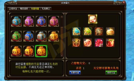 开启第15阶充值礼包,累计提取达一定元宝即可领取!神力魂石、高级特戒等稀有物品应有尽有!