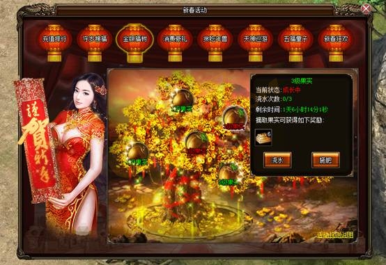 活动内容:金银福树集天地灵气凝结出不同等级的果实。不同等级的果实成长所需的时间不同,玩家可通过浇水或施肥加速。果实成熟后可摘取,也可选择消耗一定元宝升级,最高可提升至5级,果实等级越高,摘取所得的奖励越好:特戒,幸运骰子,黄金屠龙装备应有尽有!