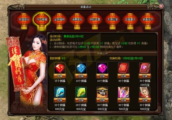 福到好运到,新的一年里《烈火战神》送你绵绵福运,只要每天在线达到一定时间就能获得系统送出的“倒福”,收集“倒福”可以兑换各种强悍道具以及强力英雄!